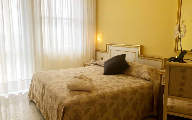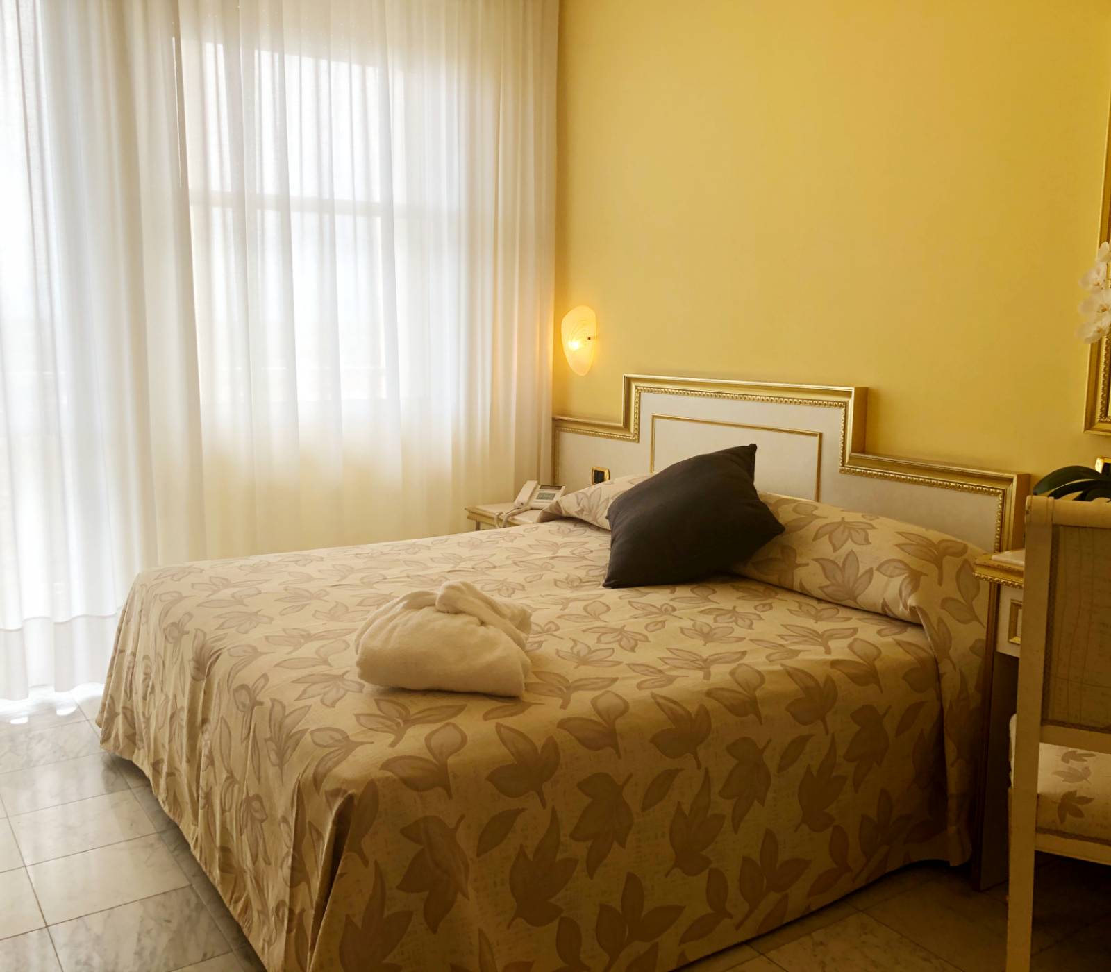Camera Singola piccola arredata con letto matrimoniale, gradevole e dagli spazi minimali di circa 12m². Dotata di: terrazza, aria condizionata, TV a led, cassaforte, frigo bar, bagno finestrato e asciugacapelli.